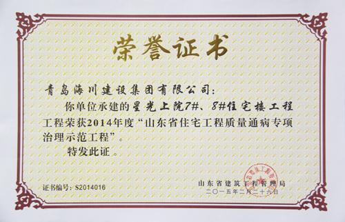 公司最近從省建筑工程管理局接連捧回四項省級榮譽證書,分別是:一分公司中創(chuàng)大廈工程榮獲“2014年度山東省建筑工程優(yōu)質(zhì)結(jié)構(gòu)杯獎”,四分公司星光上院7#、8#住宅樓工程榮獲“2014年度山東省住宅工程質(zhì)量通病專項治理示范工程”。七分公司青島農(nóng)業(yè)大學新建科技實驗樓工程接連榮獲“2014年度山東省建筑施工安全文明標準化優(yōu)良工地”和 “2014年度山東省建筑工程優(yōu)質(zhì)結(jié)構(gòu)杯獎”兩項榮譽。